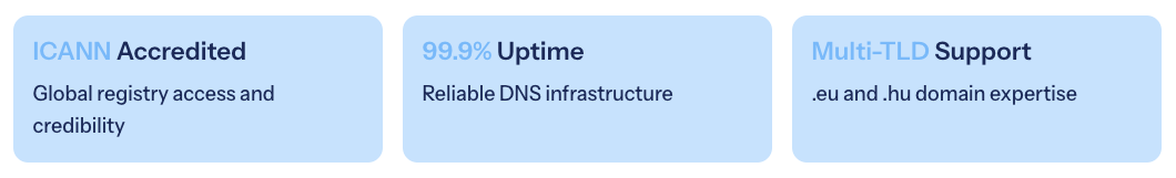 With 99.9% DNS availability, DotRoll is one of the few ICANN-accredited registrars in Hungary, and is also accredited for .eu and .hu domains, ensuring global credibility and direct registry access.