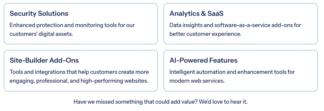 We’re scouting market-ready, scalable solutions for a go-to-market/scaling partnership with DotRoll and the Namespace Group. There are no strict thematic limits: we’re interested in any product or service that can complement or elevate DotRoll’s offering. For example: