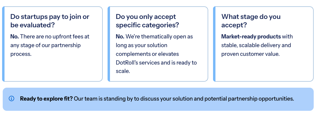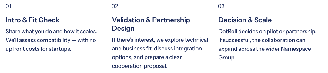 This opportunity is not about investment or acquisition, but about positioning startups within DotRoll’s (and later, potentially Namespace Group’s) customer base through flexible collaboration models.